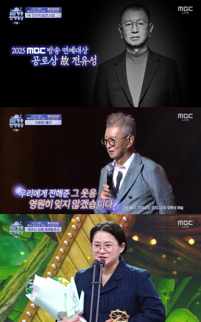 지난 29일 방송된 ‘2025 MBC 방송연예대상’에서는 공로상으로 고 전유성이 호명됐다. 대리 수상을 위해 제자 김신영이 무대에 올라 트로피와 꽃다발을 받았다.