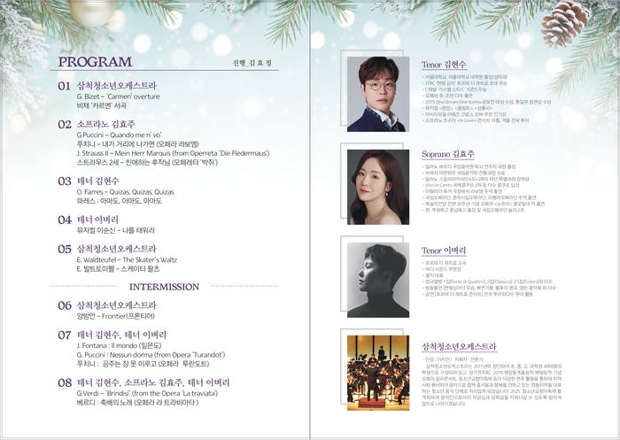 공연 프로그램은 비제의 카르멘 서곡을 시작으로, 푸치니와 스트라우스, 베르디 등 친숙한 오페라 명곡과 왈츠, 합창곡까지 다채롭게 구성됐다. 특히 ‘네순 도르마’, ‘축배의 노래’ 등 대중에게 사랑받는 곡들이 연주돼 남녀노소 누구나 편안하게 즐길 수 있는 무대가 될 것으로 기대된다.