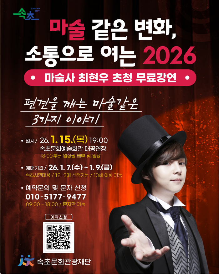 [스포츠서울ㅣ김기원기자]속초문화관광재단(이사장 이병선)이 오는 1월 15일(목) 오후 7시, 속초문화예술회관 대공연장에서 마술사 최현우를 초청해 강연과 퍼포먼스가 결합한 기획강연 ‘마술 같은 변화, 소통으로 여는 2026’을 개최한다.