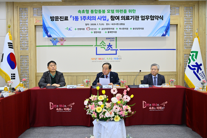 [스포츠서울ㅣ김기원기자]속초시가 1월 7일, 시청 상황실에서 관내 7개 의료기관과 통합돌봄 방문진료 ‘1동 1주치의 사업’ 추진을 위한 업무협약을 체결하며 지역사회 기반 통합돌봄 체계 강화에 나섰다.