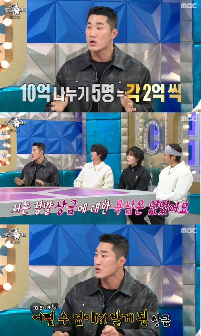 그러자 김구라가 “결국 (상금) 받아가지 않았냐”고 하자 김동현은 “그게 아니고 넷플릭스에서 10억을 6명에게 똑같이 나눠서 입금해줬다”고 말했다.