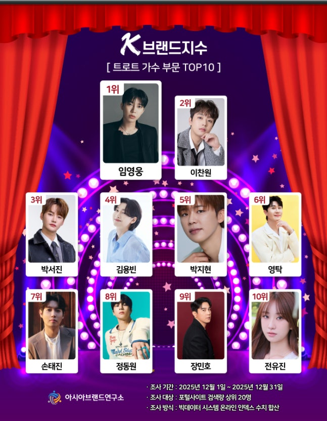 류원선 아시아브랜드연구소 리서치센터장은 “이번 K-브랜드지수 트로트 가수 부문은 임영웅·이찬원 양강 구도가 확고해진 가운데, 신구 가수들의 세대 교체 양상이 두드러진 것이 특징이다. 상위권 가수들이 상당수 유지된 점은 강한 팬덤 기반과 대중 인지도가 견고하게 작동하고 있음을 보여주는 상황”이라고 평가했다.
