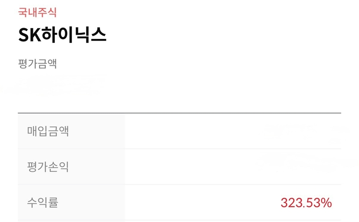 국내 대표 반도체주인 SK하이닉스의 수익률이 무려 323.53%를 기록하고 있다. 매입 금액과 평가 손익은 가려져 있으나 붉은색으로 선명하게 찍힌 ‘323.53%’라는 숫자가 보는 이들의 감탄을 자아낸다.