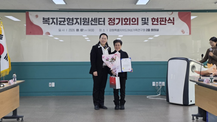 [스포츠서울ㅣ춘천=김기원기자]강원특별자치도여성가족연구원(원장 김숙영) 복지균형지원센터는 2026년 1월 7일(수), 센터 출범 3주년(1월 9일)을 맞아 ‘복지균형지원센터 유공자 시상 및 현판 제막식’을 개최했다.