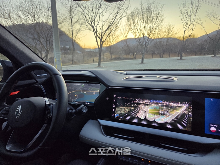 문을 열고 마주한 실내는 노래 가사처럼 르노가 가진 기술을 ‘다 바친’ 느낌이다. 가장 먼저 시선을 압도하는 건 대시보드를 가득 채운 3개의 12.3인치 ‘오픈R 파노라마 스크린’이다.