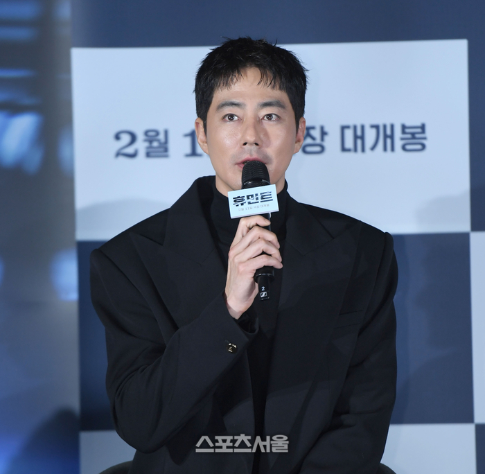 조인성이 12일 서울 성동구 롯데시네마 건대입구에서 열린 영화 ‘휴민트’ 제작보고회에서 질문에 답하고 있다.