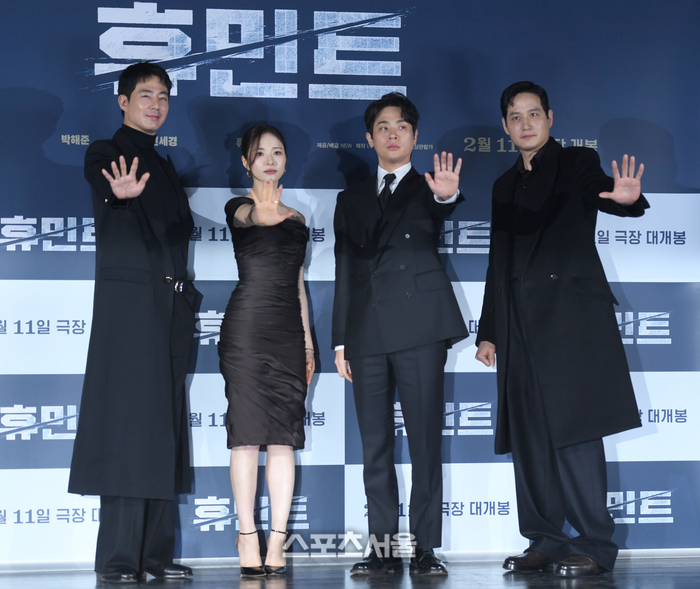 조인성, 신세경, 박정민, 박해준이 12일 서울 성동구 롯데시네마 건대입구에서 열린 영화 ‘휴민트’ 제작보고회에서 포즈를 취하고 있다.