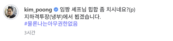 이에 김풍은 “임짱 셰프님 힙합 좀 치시네요? 지하격투장(냉부)에서 뵙겠습니다”라며 임성근과 맞대결을 예고했다. 마지막엔 “물론 나는 아무 권한 없음”을 덧붙여 웃음을 자아냈다.