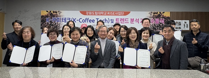 [스포츠서울ㅣ김기원기자]강원도립대학교(총장 최종균, 이하 대학)는 지역산업을 선도할 전문인재 양성을 목표로, 커피도시 강릉의 소상공인과 청년 창업가의 직무역량 강화를 위해 개설한 「K-Coffee Tech 및 트랜드 분석 교육과정」 수료식을 1월 14일(수) 개최했다고 밝혔다.