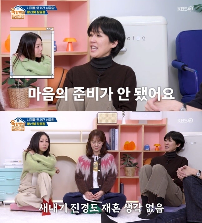 15일 방송된 KBS 2TV ‘옥탑방의 문제아들’에서는 황신혜가 “결혼은 아닌데 연애는 하고 싶다. 진경이는 어떠냐”라고 묻자, 홍진경은 “마음의 준비가 안 돼 있다. 재혼 생각 없다”라고 단호하게 말했다.