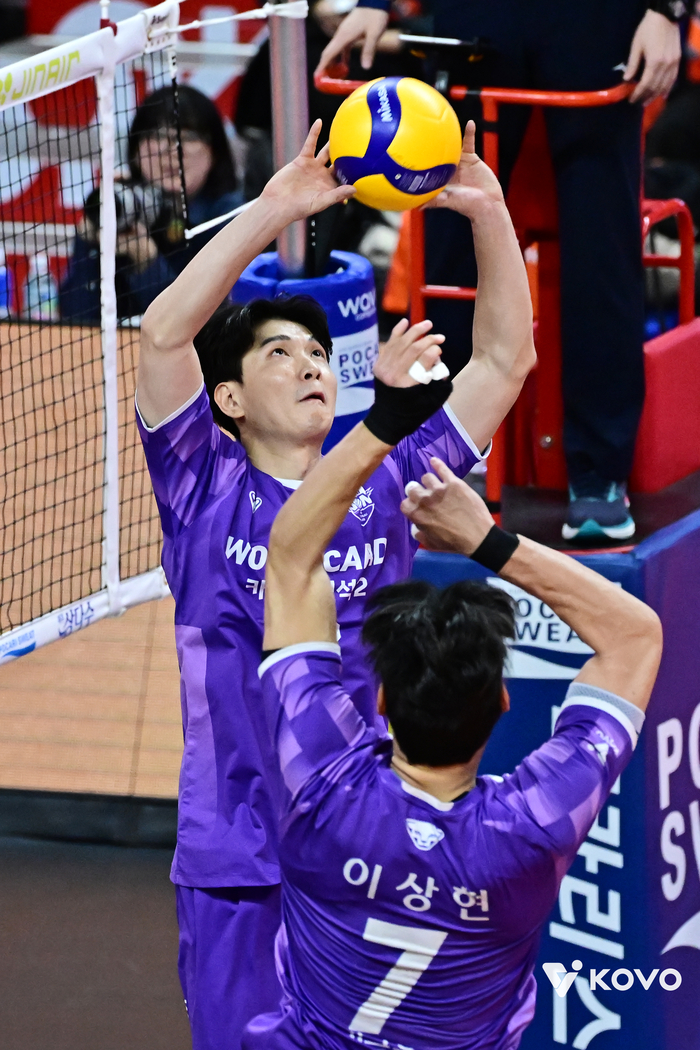 우리카드 세터 이승원(33)은 15일 수원체육관에서 열린 한국전력과 진에어 2025~2026 V리그 남자부 맞대결에서 ‘게임 체인저’ 구실을 톡톡히 해냈다. 우리카드는 한국전력을 세트 스코어 3-2로 역전승을 거뒀다.