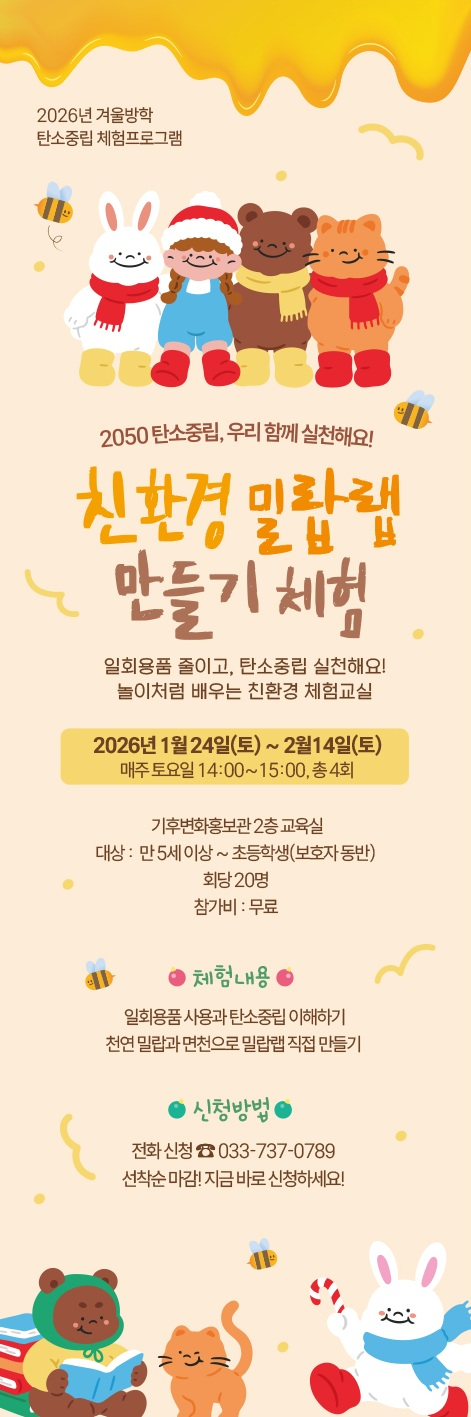 모집 인원은 회당 선착순 20명씩이며, 참가 신청은 기후변화홍보관 전화(☎033-737-0789) 또는 현장 접수로 진행된다.