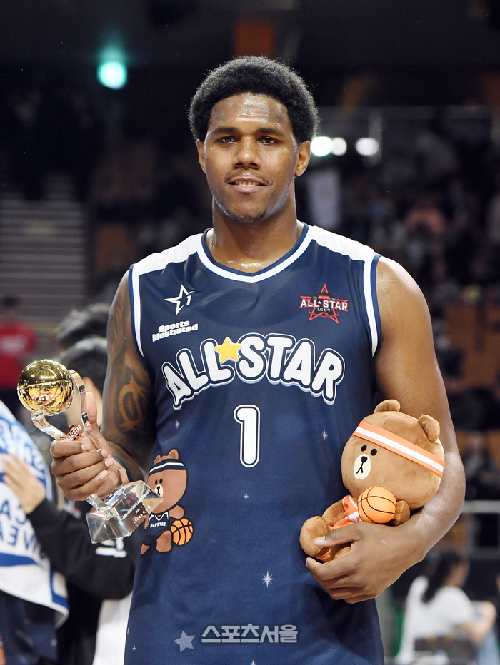 소노 나이트가 18일 서울 잠실실내체육관에서 열린 2025~2026 LG전자 프로농구 올스타전에서 MVP로 선정된 뒤 취재진을 향해 포즈를 취하고 있다. 2026. 1. 18.