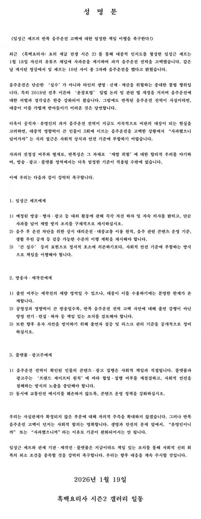 팬들이 가장 강하게 요구한 대목은 임성근의 대외활동 중단이다. 성명문은 임성근 셰프에게 ‘예정된 방송 행사 광고 등 대외 활동에 관해 즉각 자진하차 및 자숙 의사’를 촉구했다. 이어 단순 사과를 넘어 재발 방지 조치를 구체적으로 제시하라고 요구했다.