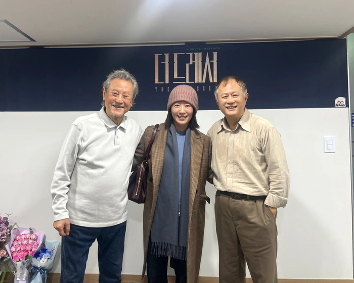 공개된 사진 속 김희애는 연극 <더 드레서>의 주역인 ‘선생님’ 역의 박근형, ‘노먼’ 역의 송승환과 함께 나란히 서서 미소 짓고 있다. 무대 위 강렬한 카리스마를 잠시 내려놓은 선배들과 그들을 응원하기 위해 방문한 후배의 모습이 보는 이들에게 훈훈함을 자아낸다.