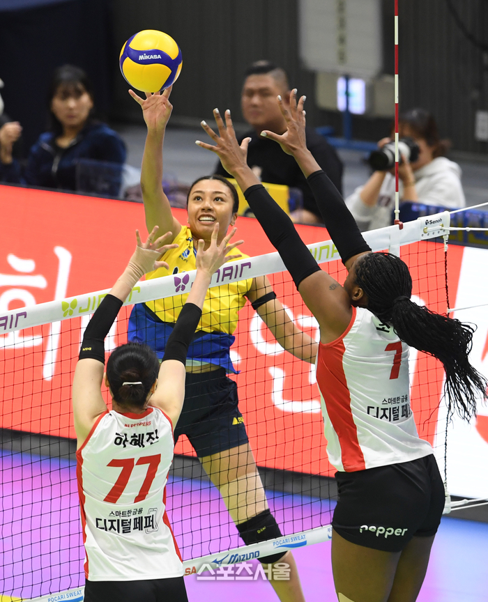 현대건설 자스티스(가운데)가 21일 수원체육관에서 열린 2025-2026 V리그 여자부 페퍼저축은행과의 경기에서 페인트 공격을 하고 있다, 2026. 1. 21.