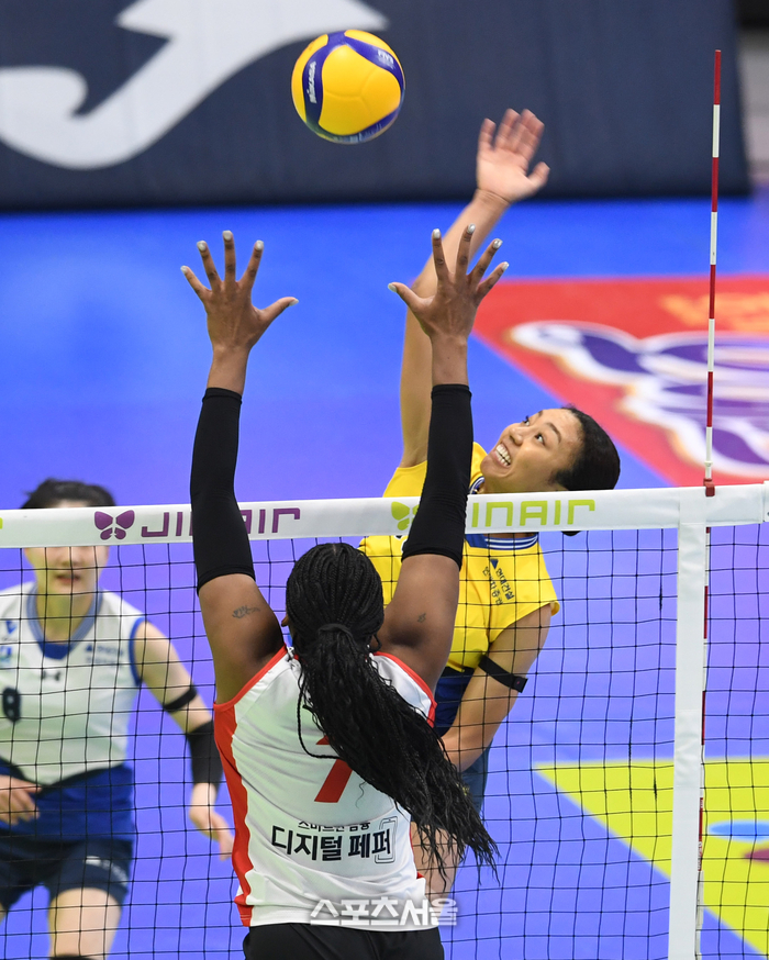 현대건설 자스티스(오른쪽)가 21일 수원체육관에서 열린 2025-2026 V리그 여자부 페퍼저축은행과의 경기에서 스파이크 공격을 하고 있다, 2026. 1. 21.