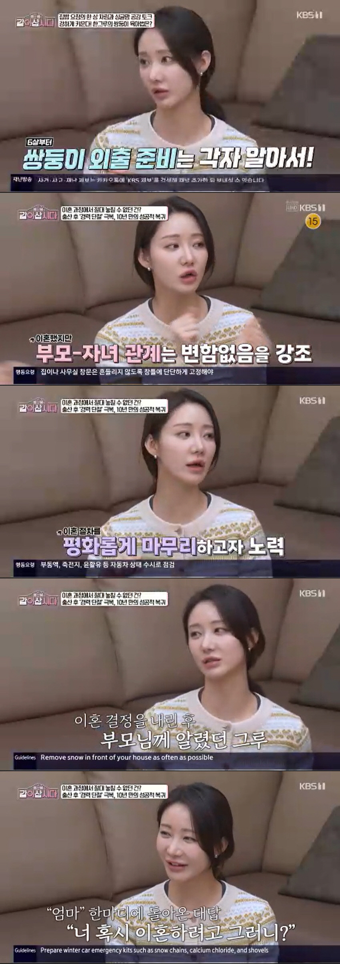 이어 “애들한테는 그렇게 하기 싫었다. 그게 아이들을 위한 최소한의 배려라고 생각했다. 이혼하면서 절대 싸우지 말자고 생각했다”면서 “남편이랑 모든 얘기가 끝난 뒤에 부모님께 이야기했다”고 부모님께 이혼 소식을 통보하게 된 과정을 설명했다.