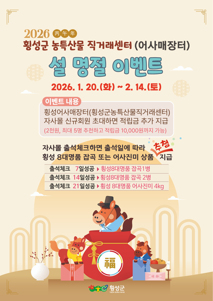 [스포츠서울ㅣ김기원기자]횡성군 농특산물 직거래센터의 공식 온라인 쇼핑몰인 ‘횡성어사매장터’가 2026년 설 명절을 맞아 지역 농특산물 소비 촉진을 위한 특별 이벤트를 진행한다.