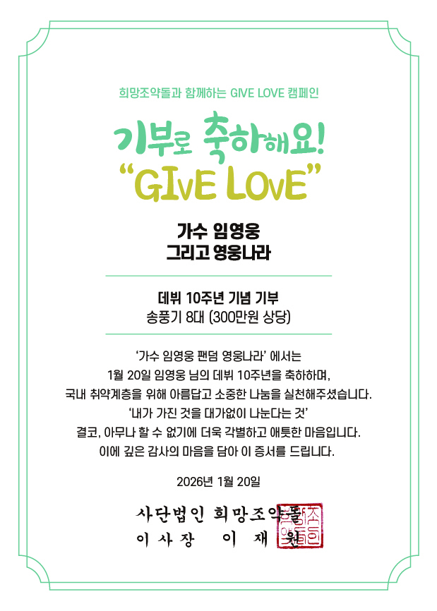 팬카페 영웅나라는 2026년 임영웅 데뷔 10주년을 맞는 뜻깊은 해를 앞두고 ‘희망찬 시작이야 HERO’라는 슬로건 아래 희망 조약돌에 300만 원 상당의 물품을 기부했다.