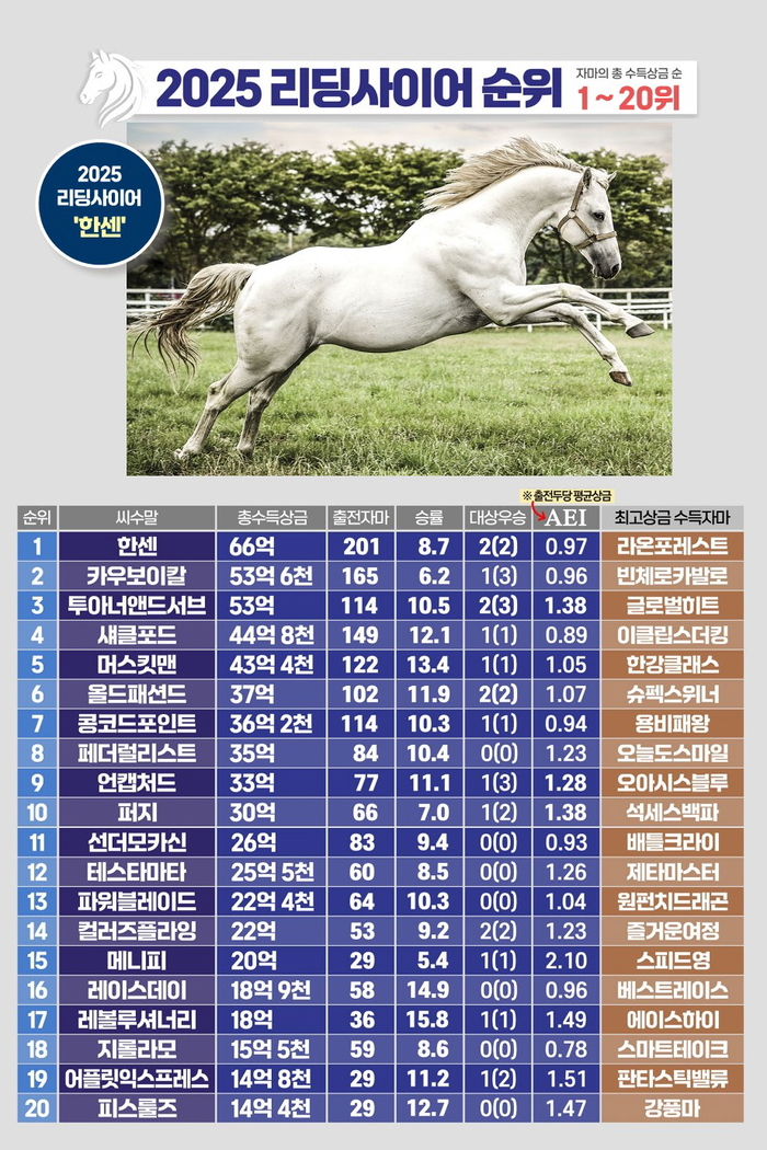 한센은 2025년에도 자마의 다승 활약에 힘입어 리딩사이어를 지켜냈다. 200두가 넘는 자마가 단·중거리 경주에 고르게 출전하며 안정적인 상금 누적을 이끌었다. 자마 평균상금(AEI)이 1을 넘지 못한 점은 아쉽지만 하위 등급부터 상위 등급까지 폭넓은 활약을 펼쳤다는 점이 강점이다.