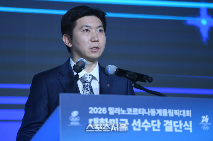 유승민 대한체육회장이 22일 서울 송파구 올림픽파크텔에서 열린 2026 밀라노코르티나 동계올림픽 대한민국 선수단 결단식에서 개식사를 하고 있다.