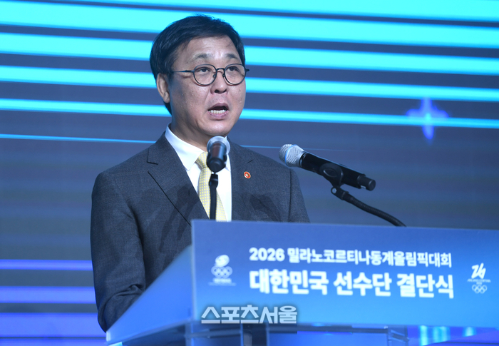 최휘영 문화체육관광부 장관이 22일 서울 송파구 올림픽파크텔에서 열린 2026 밀라노코르티나 동계올림픽 대한민국 선수단 결단식에서 격려사를 하고 있다.
