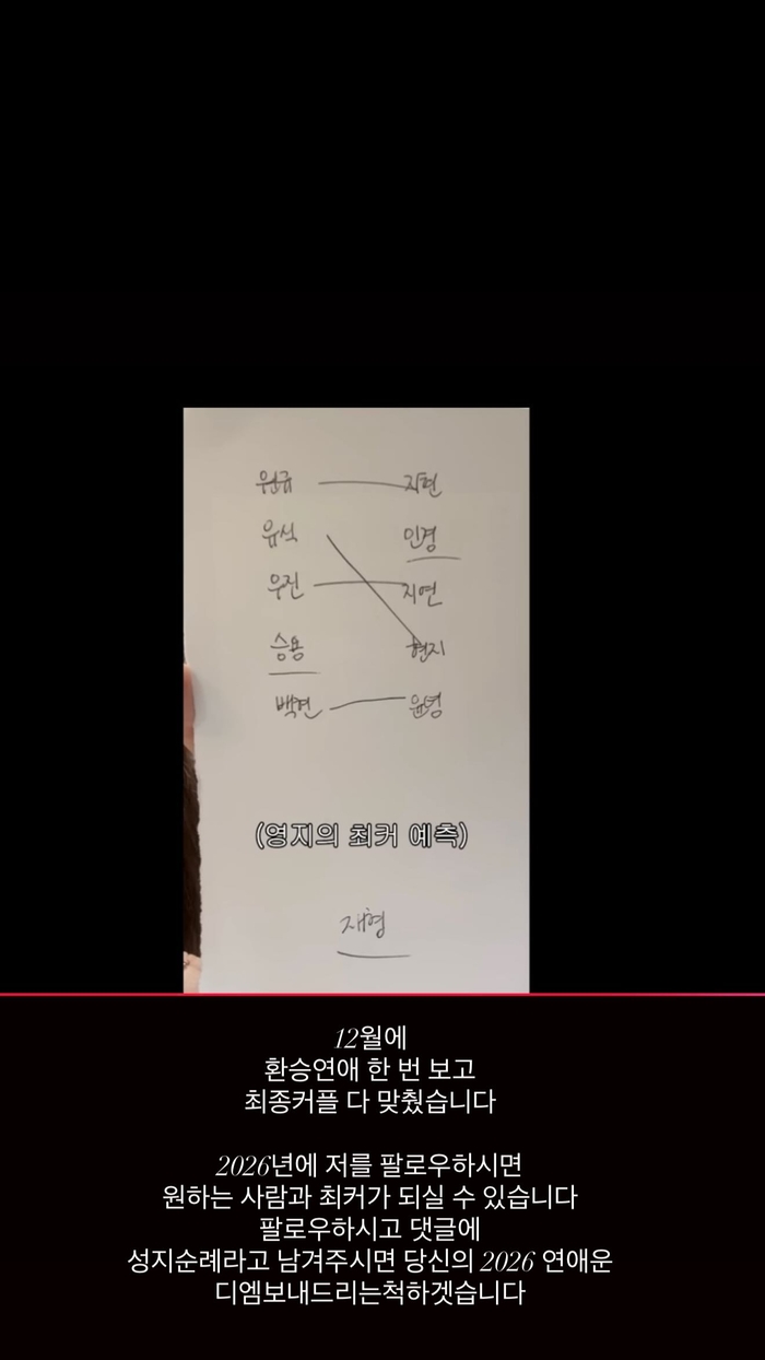 그는 이어 “2026년에 저를 팔로우하시면 원하는 사람과 최커(최종 커플)가 되실 수 있다”며 “성지순례라고 남겨주시면 당신의 2026 연애운 디엠 보내드리는 척하겠다”고 농담 섞인 제안을 건넸다.