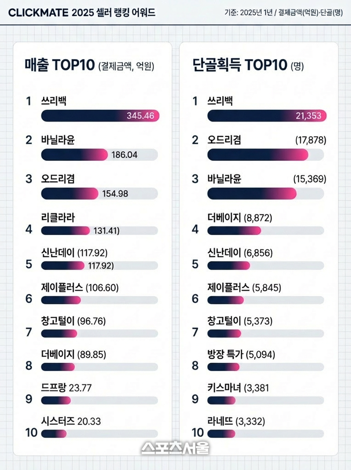 이번 랭킹에서 돋보이는 셀러는 ‘쓰리백’이다. 쓰리백은 결제금액 345.46억 원으로 매출 1위를 기록했고, 단골획득에서도 213,530명으로 1위에 올랐다. 매출과 팬덤을 동시에 만든 사례로, 단기 판매력을 넘어 고객자산을 축적한 셀러 모델로 평가된다. “매출규모만 큰 셀러”가 아니라 “매출과 팬덤을 동시에 만든 셀러”가 정상에 선 셈이다. 매출 상위권에는 바닐라윤(186.04억), 오드리겸(154.98억), 리클라라(131.41억), 신난데이(117.92억), 제이플러스(106.60억), 창고털이(96.76억), 더베이지(89.85억) 등이 포진했다. 볼륨 경쟁력을 갖춘 셀러들이 상위권을 형성하며 ‘규모의 경제’가 작동하는 시장 흐름도 확인됐다.