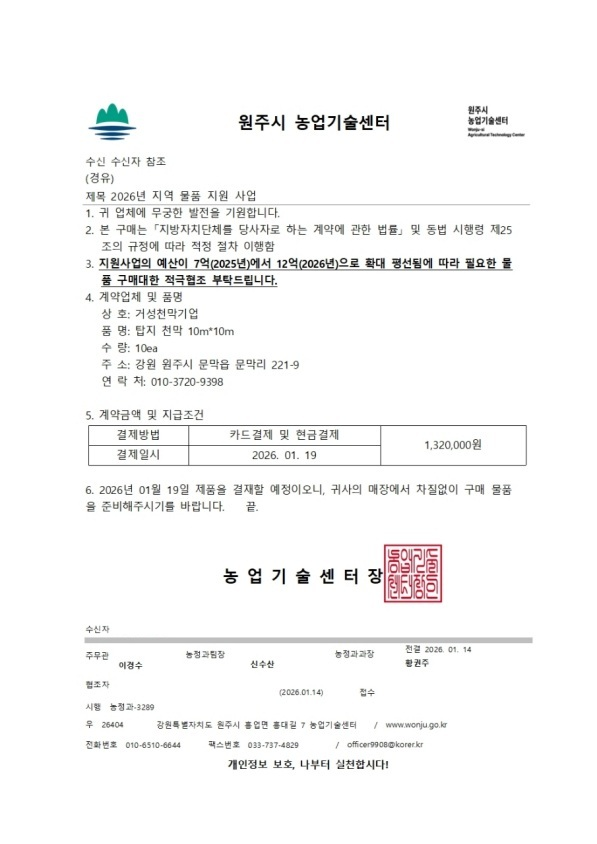 원주시 관계자는 “유사 사례 발생 시 해당 공공기관과 관할 경찰서에 신속히 신고해 주시길 바란다”며 “시민과 지역 업체의 피해 예방을 위해 지속적인 안내와 협조를 이어가겠다”라고 말했다.