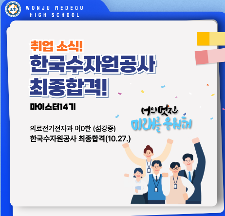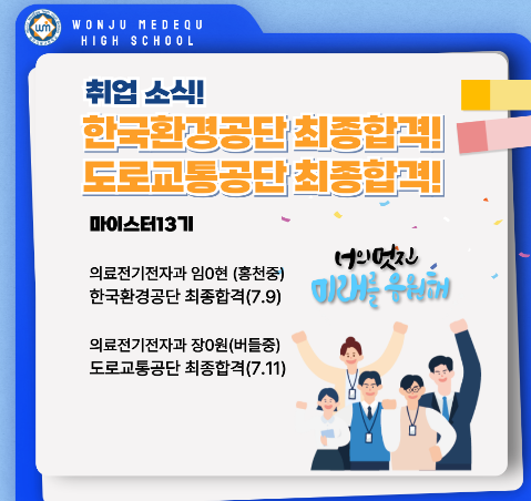 공기업 취업 사례도 이어졌다. 한국수자원공사에 의료전기전자과 △이0한(원주 섬강중)이 합격하였다. 이외에도 ㈜파마리서치, 대원제약(주), 비씨월드헬스케어(주), ㈜나이벡, ㈜덴티움등 우수기업 취업에 성공하였다.