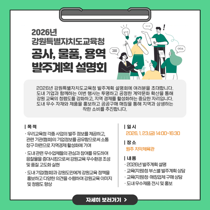 도교육청은 도내 중소기업체 및 협회 관계자들을 대상으로 2026년 도교육청과 교육지원청이 추진하는 총 1,254건, 약 3,473억 원 규모의 발주계획에 대한 세부 정보를 상세히 안내한다.