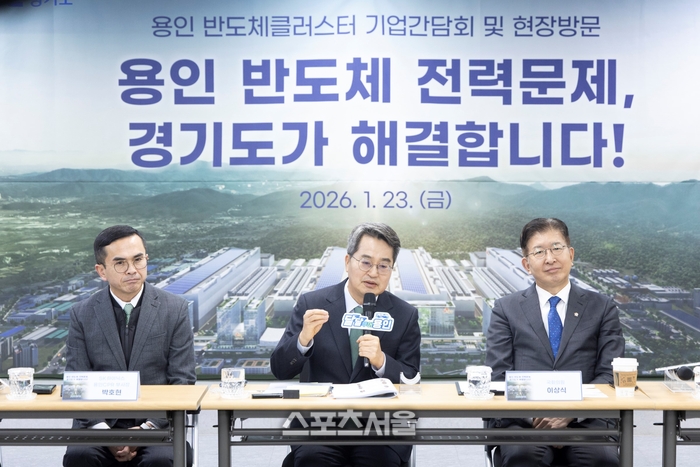 간담회서 김 지사는 하루 전 발표한 용인 반도체클러스터 전력 문제 해법이 주로 언급됐다. 김 지사는 지난 22일 한전과 ‘도로-전력망 공동건설 협력체계 구축 업무협약’을 체결해 새로 건설하는 지방도 318호선 용인·이천 27.02㎞ 구간 땅 밑으로 전력망을 구축하기로 한 바 있다.