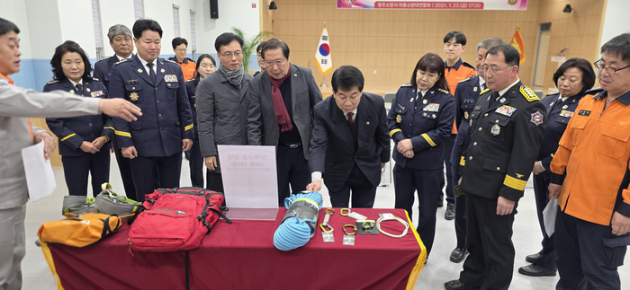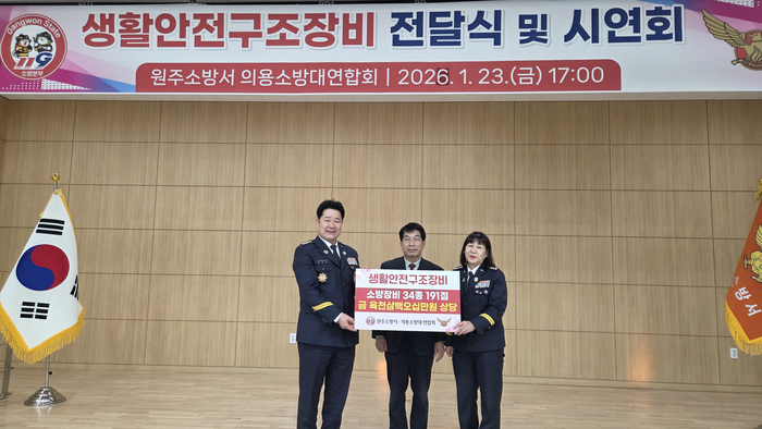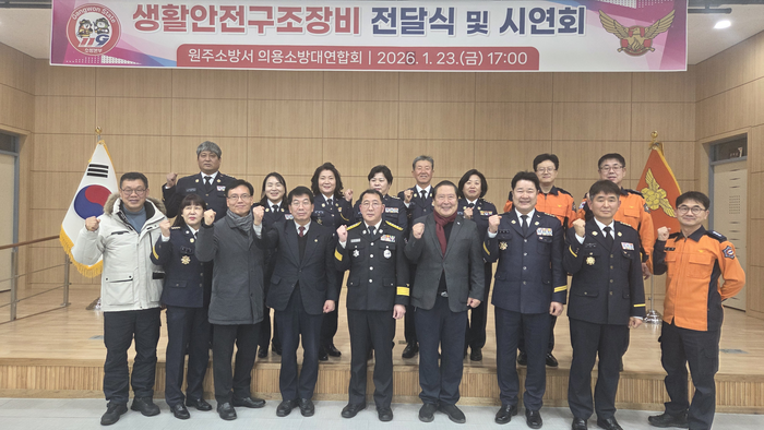 [스포츠서울ㅣ원주=김기원기자]강원특별자치도 원주소방서(서장 김정기)는 23일(금) 오후 5시 소방서 대회의실에서 하석균 도의원 등이 참석한 가운데 원주소방서 의용소방대연합회(회장 정대갑)에 생활안전 구조장비 전달식을 갖고 시연회를 개최했다.