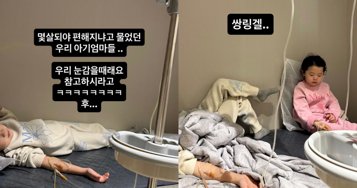 이어 이지혜는 “몇살 돼야 편해지냐고 물었던 우리 아기엄마들.. 우리 눈감을 때래요. 참고하시라고. 후..”라며 한숨을 내쉬었다. 그러면서 “쌍링겔..”이라는 글과 또 다른 사진을 공개했다. 사진 속에는 함께 나란히 링거를 맞고 있는 딸들의 모습이 담겨 안타까움을 자아냈다.