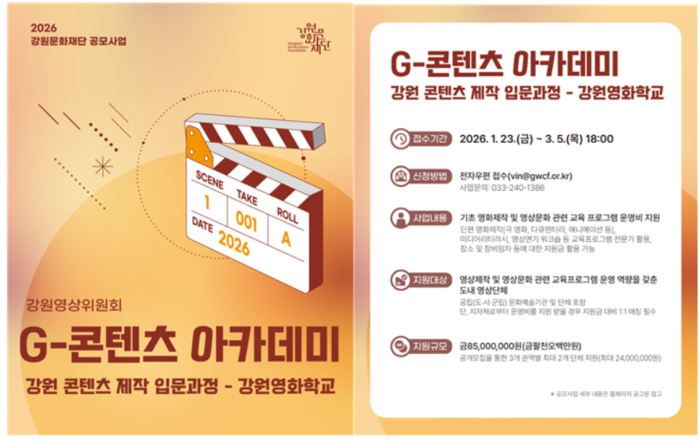 접수는 전자우편(vin@gwcf.or.kr)을 통해 가능하며, 자세한 모집 방법과 사업 내용은 강원문화재단 누리집(gwcf.or.kr) 또는 강원영상위원회 누리집(gwfilm.kr)을 통해 확인할 수 있다.