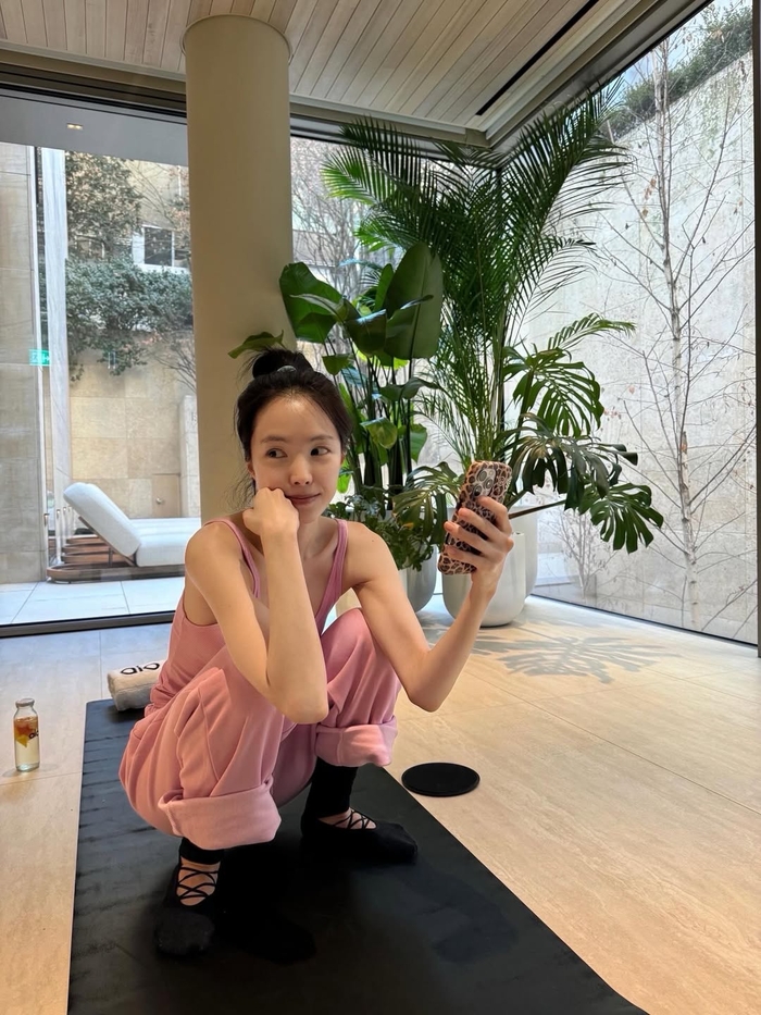 블랙 크롭톱과 레깅스를 입은 사진에서는 선명한 11자 복근과 탄탄한 복부 라인이 눈길을 끌었으며, 핑크색 트레이닝 셋업을 입고 요가 매트 위에서 휴대전화를 응시하는 모습에서는 특유의 청순하면서도 러블리한 분위기를 자아냈다.