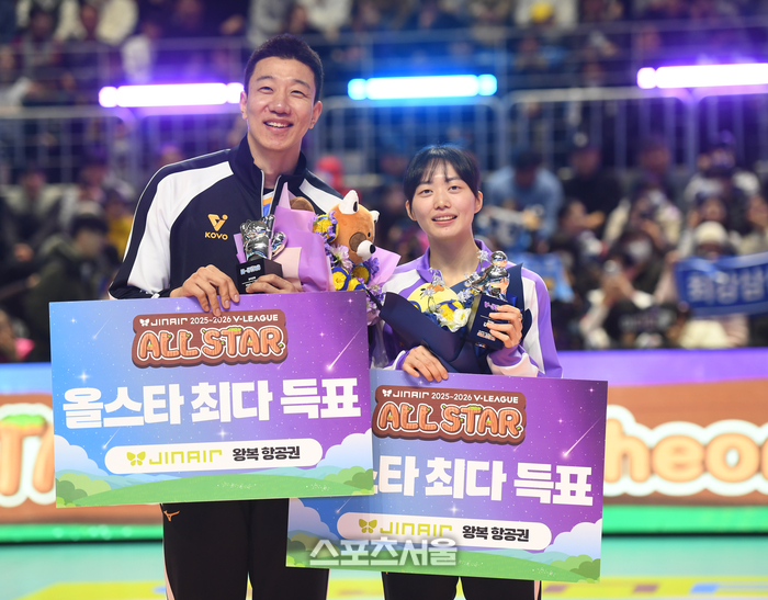 신영석과 김다인이 25일 춘천 호반체육관에서 열린 2025-2026 V-리그 올스타전에서 최다 득표상을 수상한 후 포즈를 취하고 있다.