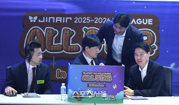 강성형 감독이 25일 춘천 호반체육관에서 열린 2025-2026 V-리그 올스타전에서 비디오 판정 요청 후 직접 비디오를 보고 있다.