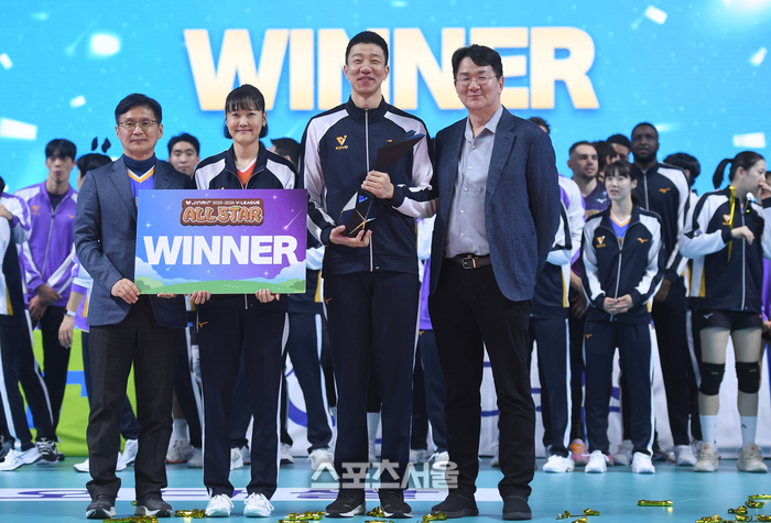 K 스타 임명옥과 신영석이 25일 춘천 호반체육관에서 열린 2025-2026 V-리그 올스타전에서 우승팀 트로피를 받은 후 포즈를 취하고 있다.