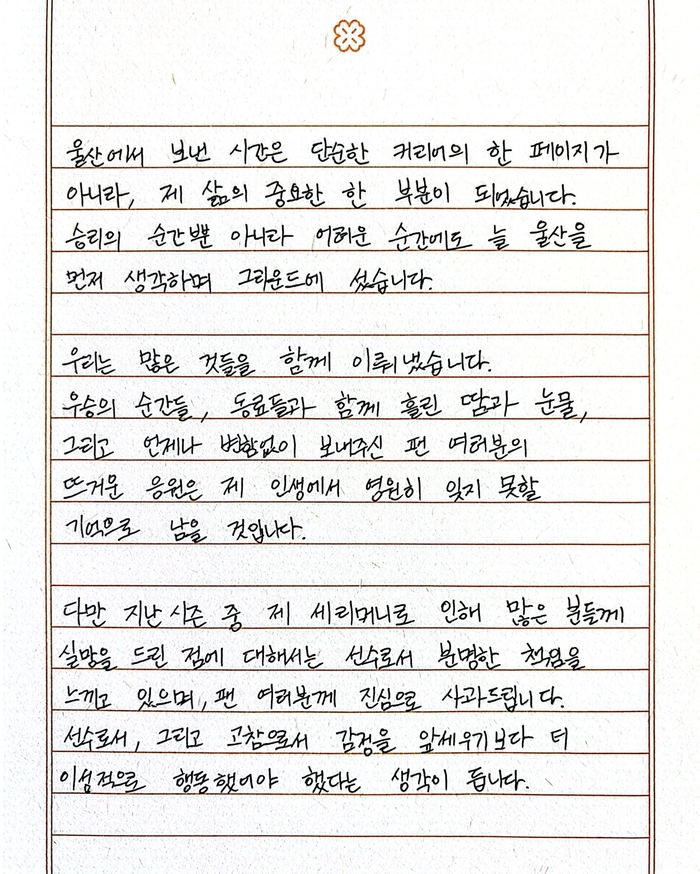 끝으로 “기분 좋게 인사드리고 웃으면서 작별하고 싶던 마음이 컸기에 이렇게 마지막을 맞이하게 된 것이 아쉬움으로 남는다”며 “울산에서 보낸 시간은 축구 인생에서 가장 값진 순간이었고, 선택이 틀리지 않았다는 것을 마음 깊이 느낀다. 앞으로도 울산을 진심으로 응원하겠다”고 덧붙였다.