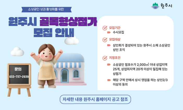 [스포츠서울ㅣ원주=김기원기자]원주시는 소상공인 상권 활성화를 위해 1월 26일부터 ‘원주시 골목형상점가’ 지정을 희망하는 상인 조직을 모집한다.
