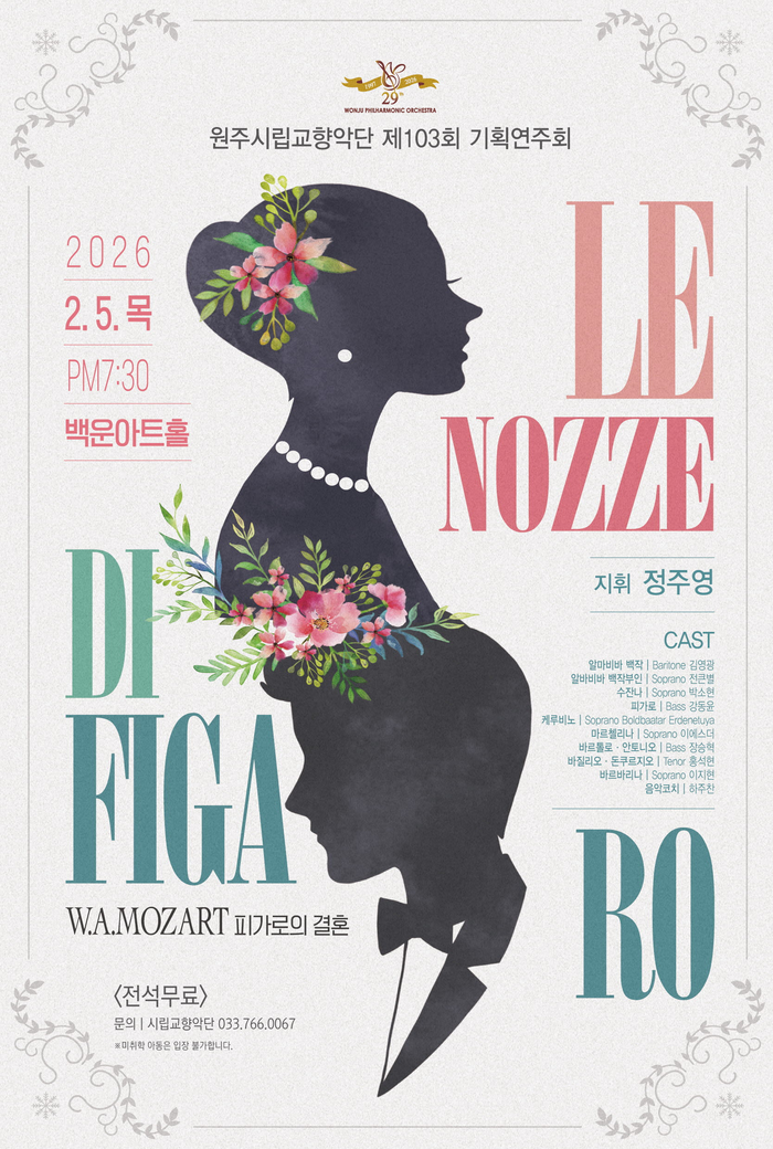 [스포츠서울ㅣ원주=김기원기자]원주시립교향악단은 오는 2월 5일 오후 7시 30분 백운아트홀에서 제103회 기획연주회 ‘피가로의 결혼’을 개최한다.