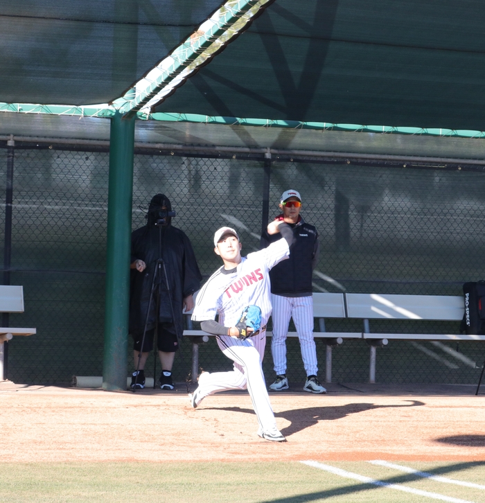 속구 구속은 시속 134~140㎞가 찍혔다. 2025년 이맘때보다 속구 구속이 더 나온다는 점이 고무적이다. 손주영은 1월 초 WBC 사이판 캠프에 참가했다. 조금 빠르게 본격적인 시즌 준비에 들어간 것. 이게 효과를 보는듯하다. 김광삼 투수코치도 이 점에 주목했다.