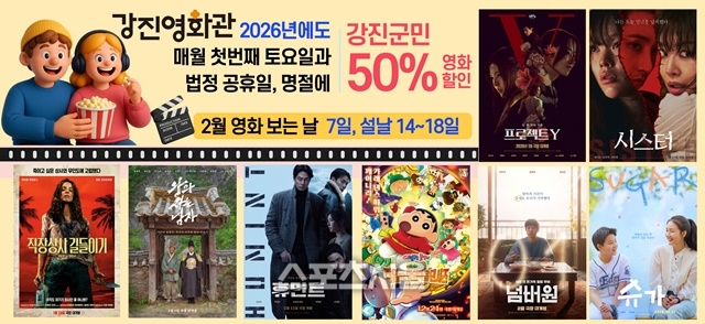 [스포츠서울𝍩 조광태기자] 전남 강진군이 민족의 대명절 설을 맞아 군민 모두가 부담 없이 영화를 즐길 수 있도록 오는 2월 7일과 2월 14일부터 18일까지 ‘2026년 영화 보는 날’ 행사를 운영한다.