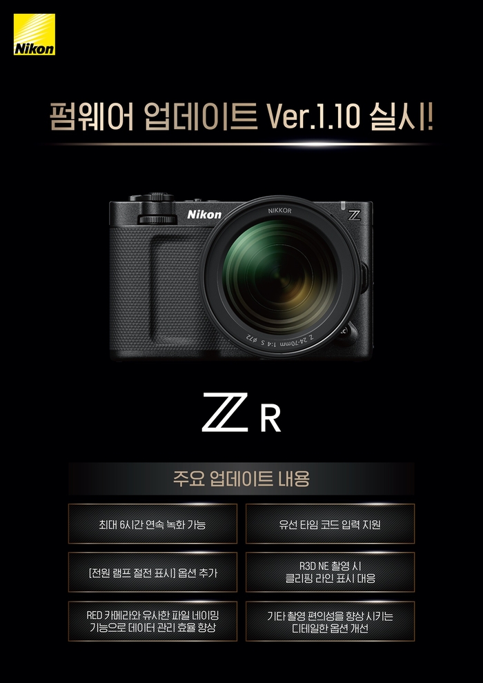 [스포츠서울 | 표권향 기자] 니콘이미징코리아가 자회사 RED Digital Cinema, Inc.(이하 RED)와 협력 개발한 풀프레임 시네마 카메라 ‘ZR’의 펌웨어 버전 1.10을 공개했다.