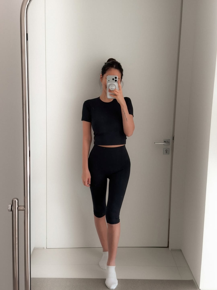 공개된 사진 속 김준희는 몸매가 고스란히 드러나는 블랙 밀착 레깅스와 크롭 톱을 입고 거울 셀카를 찍고 있다. 특히 과감하게 파인 뒷모습을 통해 드러난 선명한 기립근과 탄력 넘치는 보디라인은 보는 이들의 감탄을 자아냈다. 1976년생으로 올해 연 나이 51세라는 사실이 믿기지 않을 만큼 철저한 관리가 돋보이는 모습이다.
