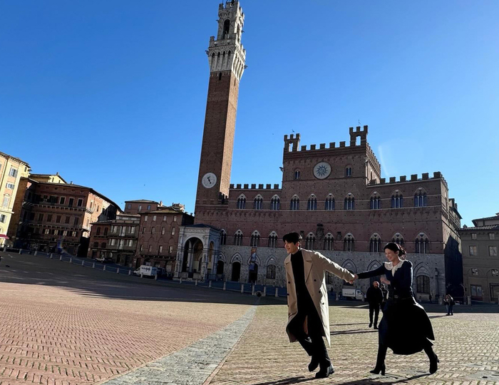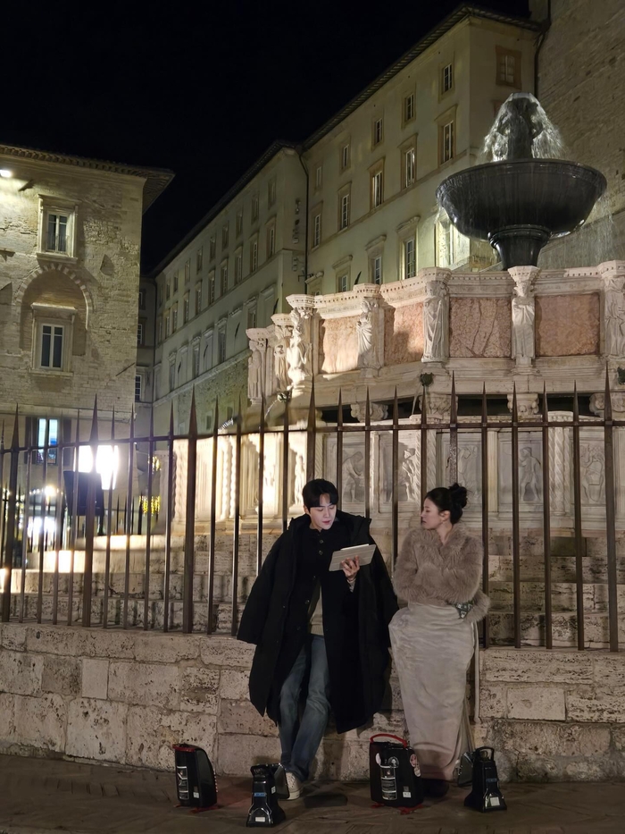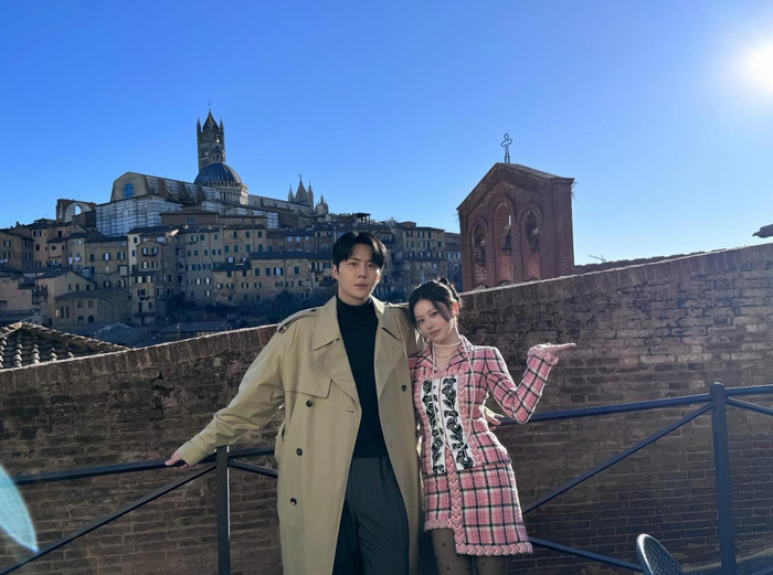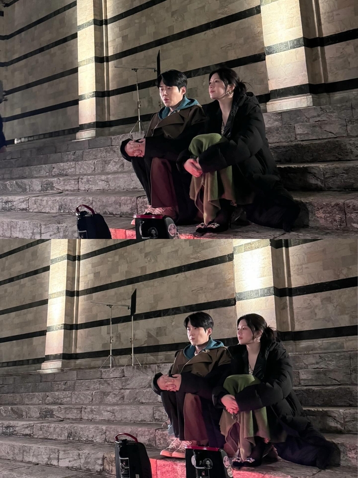 공개된 사진 속 두 사람은 이국적인 풍경을 배경으로 그림 같은 비주얼을 뽐냈다. 특히 두 사람은 자연스러운 스킨십으로 눈길을 끌었다. 밤이 내려앉은 계단에 나란히 앉은 고윤정은 김선호의 어깨에 자연스럽게 머리를 기대며 환한 미소를 지었고, 김선호 역시 다정한 눈빛으로 카메라를 응시하며 완벽한 ‘커플 포스’를 자아냈다.