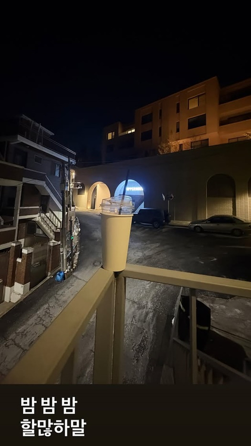 아울러 함께 올린 사진 속에는 깊은 밤 테라스 난간에 테이크 아웃 잔이 놓여 있었다.