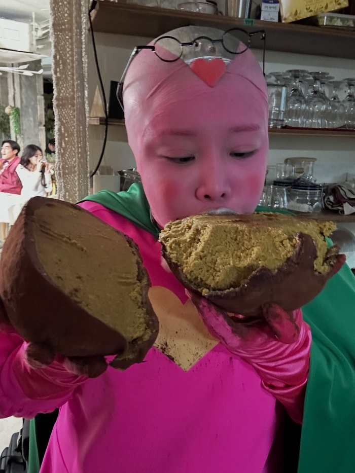 랄랄은 27일 자신의 사회관계망서비스(SNS)를 통해 AI 부캐 케이시 분장을 한 채 왕 두쫀쿠를 먹는 영상과 사진을 게시했다. ‘세계 최초의 연애코치 AI’를 표방하는 케이시는 랄랄이 유튜브 채널 ‘끝끝끝’을 통해 선보여 온 부캐 중 하나로, 핑크색 피부와 매끈한 민머리, 독특한 안경이 특징인 캐릭터다. 이번 게시물에서 랄랄은 이 파격적인 분장을 그대로 유지한 채 자신의 얼굴보다도 큰 사이즈를 자랑하는 두바이 초콜릿 스타일의 쿠키를 양손으로 들고 먹방을 진행했다.